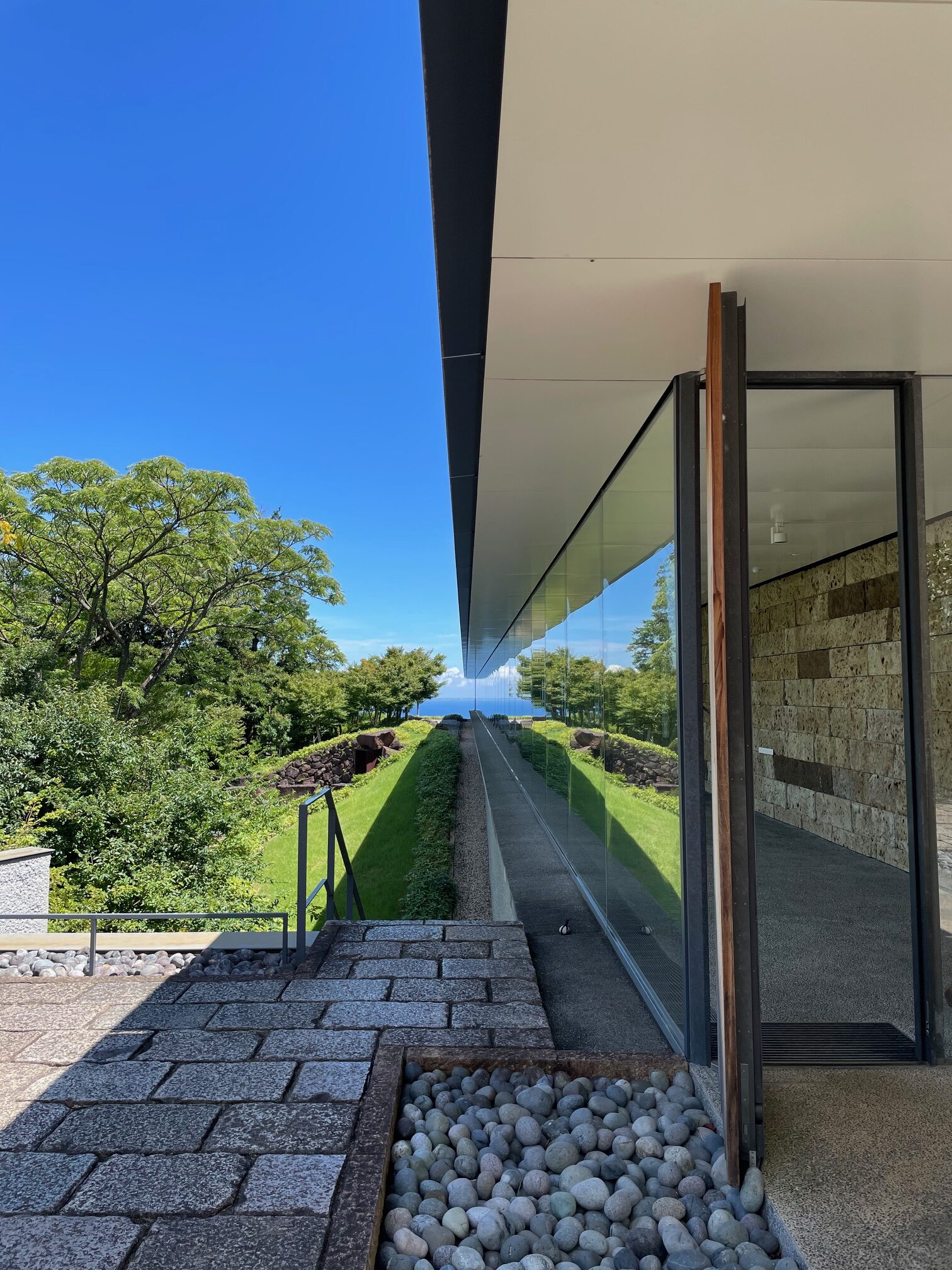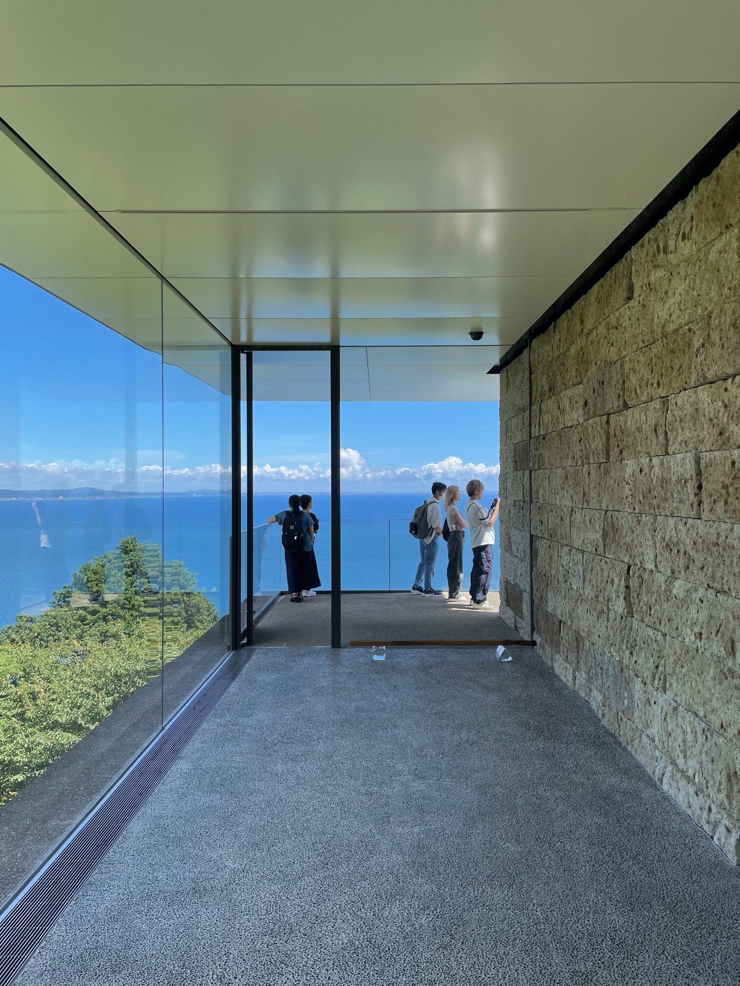 作品を見ながら100m先に進むと、傾斜した地面から突き出るようにバルコニーがあり、相模湾を一望。対岸の三浦半島、その先の太平洋が広がってます。