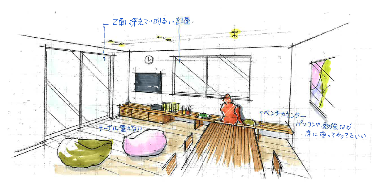 お施主様から「開放的な間取り」が欲しい。という要望をよく頂いてプランを描くことが多いのですが、全体面積が増えてコスト高になったり、構造的に耐震性を保つのに苦労したりしました。