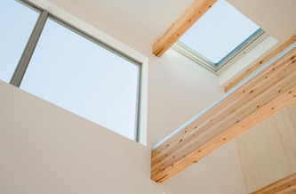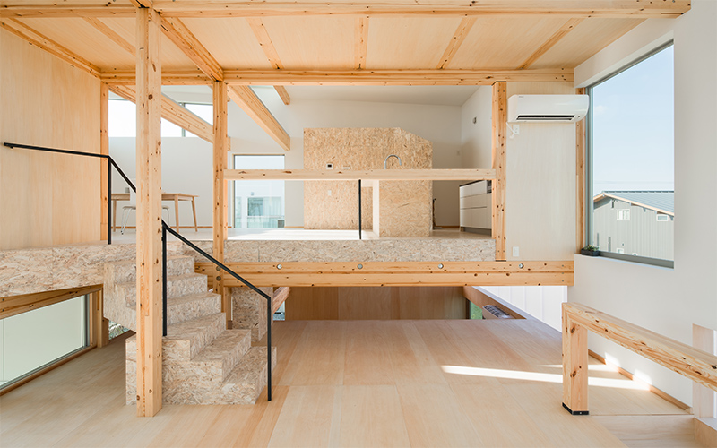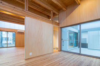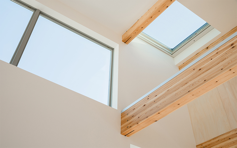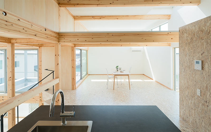 天井高が高く、様々な方向に視線の抜けがある、のびやかな住空間を設計しました。空に抜ける窓や採光用の半透明の窓、スリット窓によって、プライバシーを気にせず様々な方向からの光を取り入れます。金物と集成材をハイブリッドした耐震の(SE構法)による木の新しい空間は将来的な増改築が容易でアトリエやギャラリー、カフェなど自分好みの空間にカスタマイズできるフレキシビリティを持ちます。