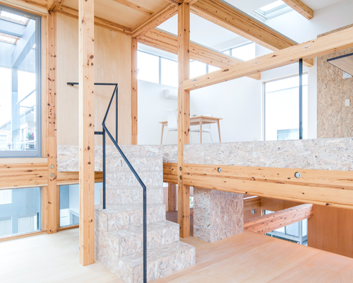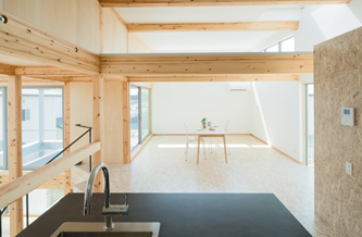 柱と梁をあらわしとし、木造の魅力を最大限生かす住空間を設計しました。壁や床にも地場産材である天竜杉をふんだんに使用することで木のあたたかみを随所に感じる空間となっています。洗い出しコンクリートやコルクフローリングなど場所ごとに異なった素材の質感を用い、シンプルでありながら素材の豊かさを感じる住まいとします。