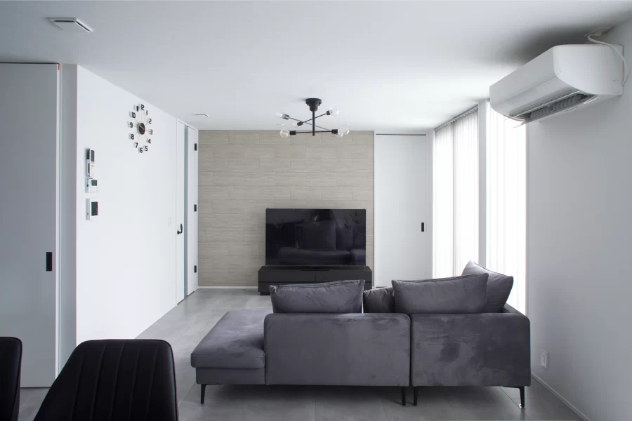 家具や照明に至るまでモノトーンに統一したホテルライクスタイルのLDK。